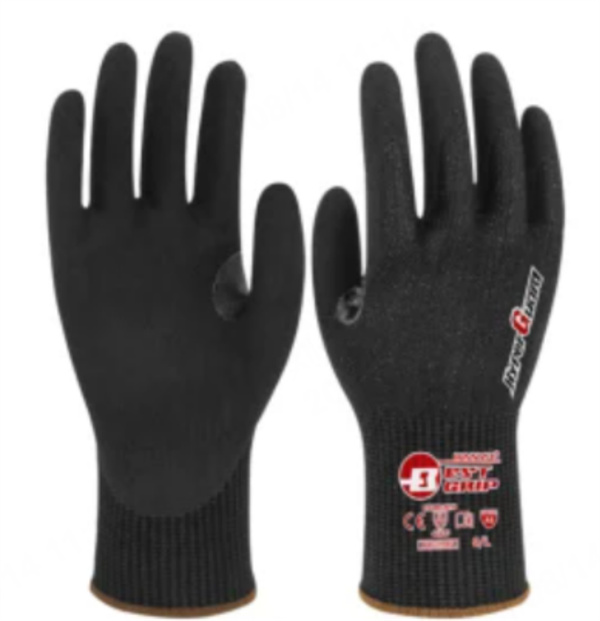 材质与工艺:采用13针HPPE+钢丝+玄武岩+氨纶混纺编织手套芯,掌浸Super Grip®丁腈发泡磨砂涂层,虎口刮胶加固。